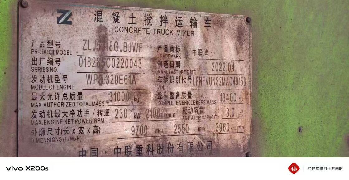 この2022年のZoomlionコンクリートミキサートラック (モデル:ZLJ518GJBJWF) は,中国の厳格な国家VI排放基準に準拠して建造された1人の所有者,保存状態の良い車両です.高性能のWeichai WP8で動いています.320E61Aエンジン完全に法的書類が備わっており,即座に所有権移転と登録が可能です.